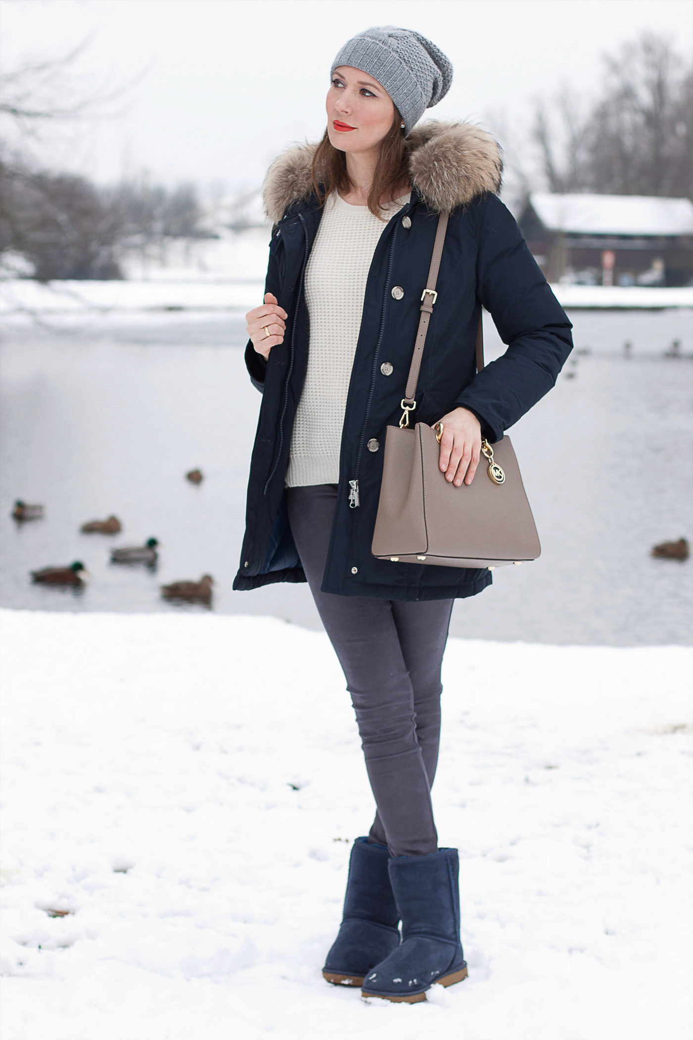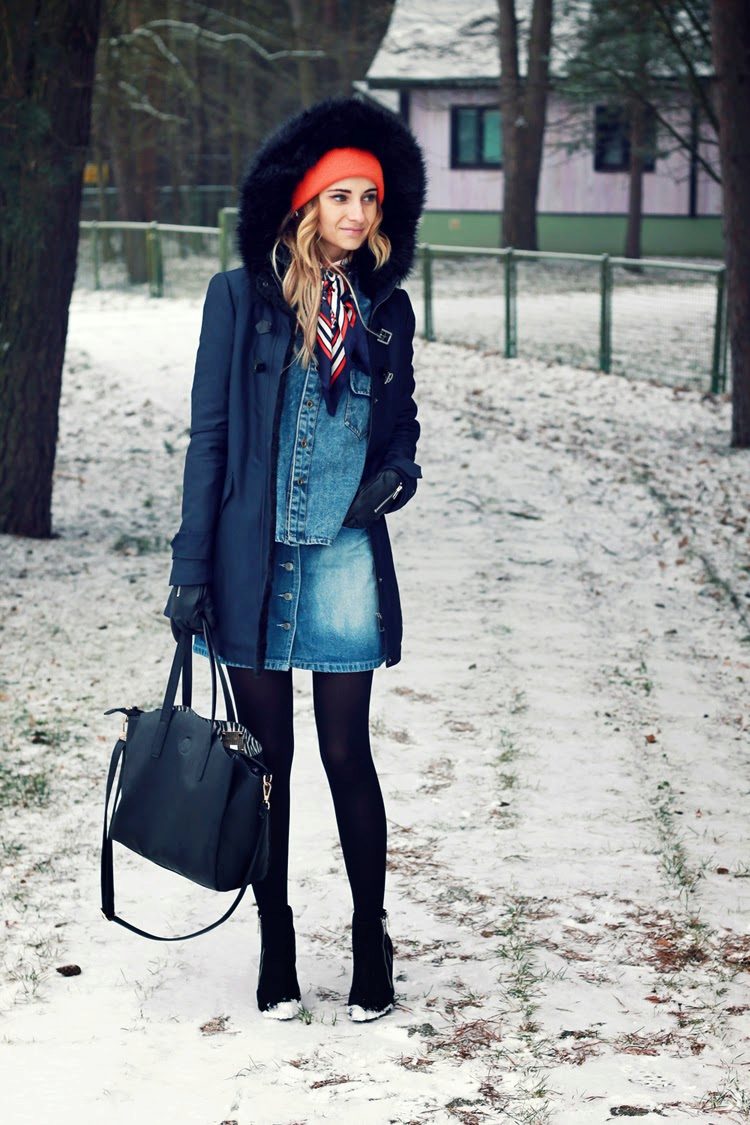 In the cold, do not forget about the headdress, the ideal option - a light hat with a large knit with a pompon. A long knitted scarf or snood, tied over the hood, will be a good complement to the winter look. In winter, blue Timberland boots or semi-boots with a flat sole combine perfectly with the blue park. The bag is better to choose a volume, not a catchy neutral shade.