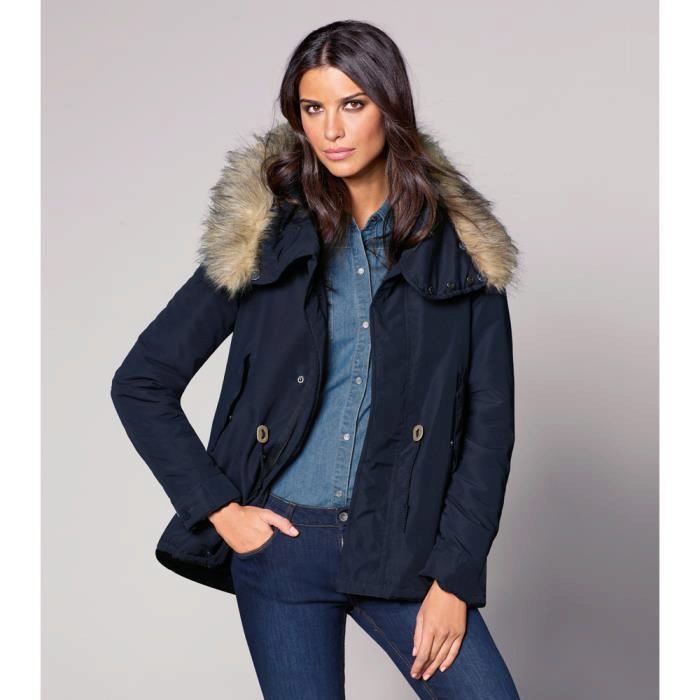 The stylish demi-season women's parka of a pleasant dark blue color, just above the knee, is insulated with soft plush fur. Laconic cut is diluted with brown leather stripes on the cuffs and in the upper part of the parks, as well as oval plugs on the drawstring.