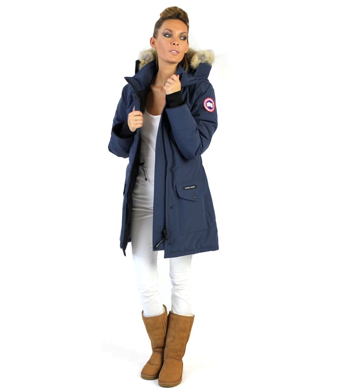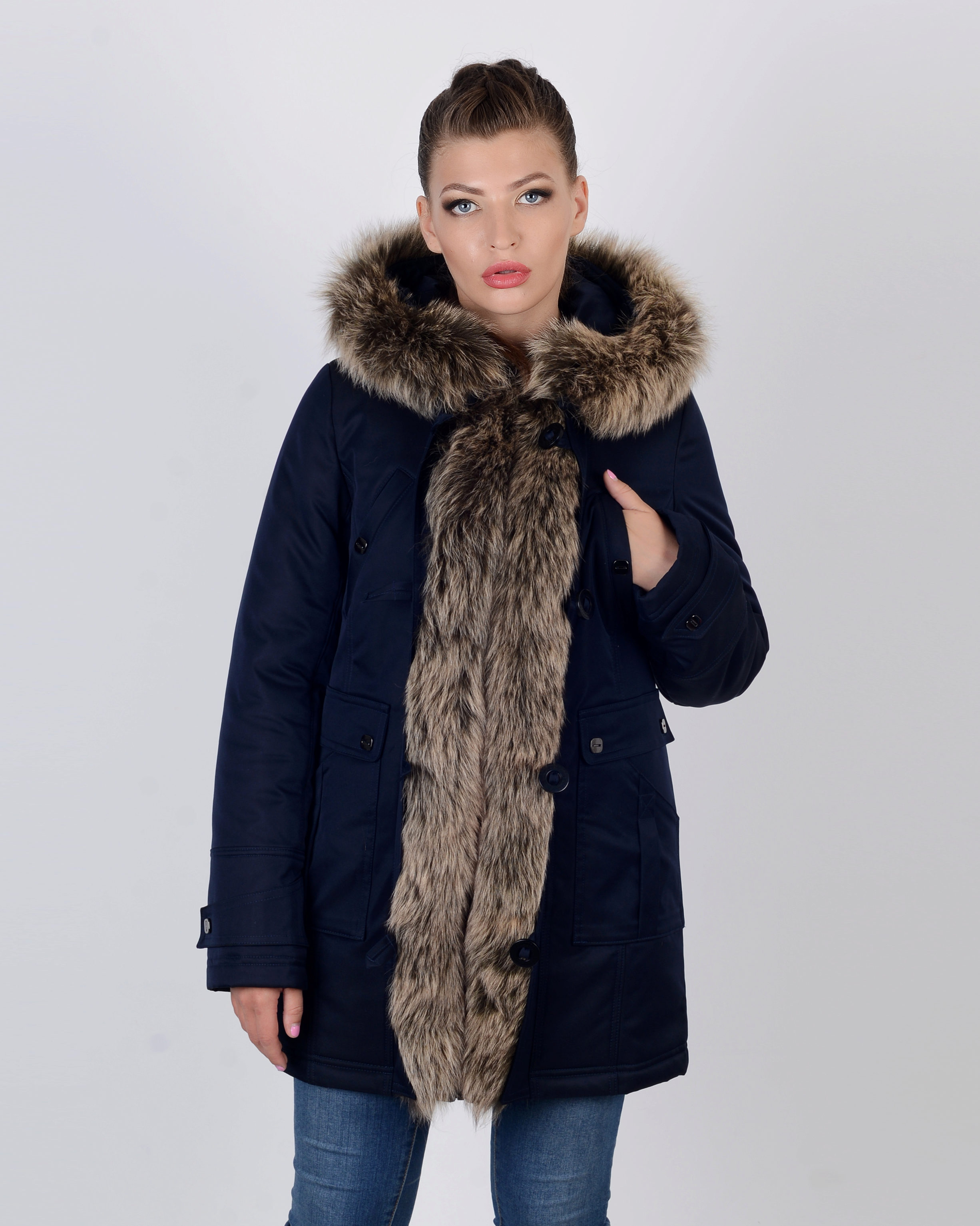Winter park of gray-blue color, insulated with goose down, specially created for extremely low temperatures. High-tech fabric protects not only from wind and moisture, but also from dirt. The warmed fleece hood is trimmed with removable coyote fur.