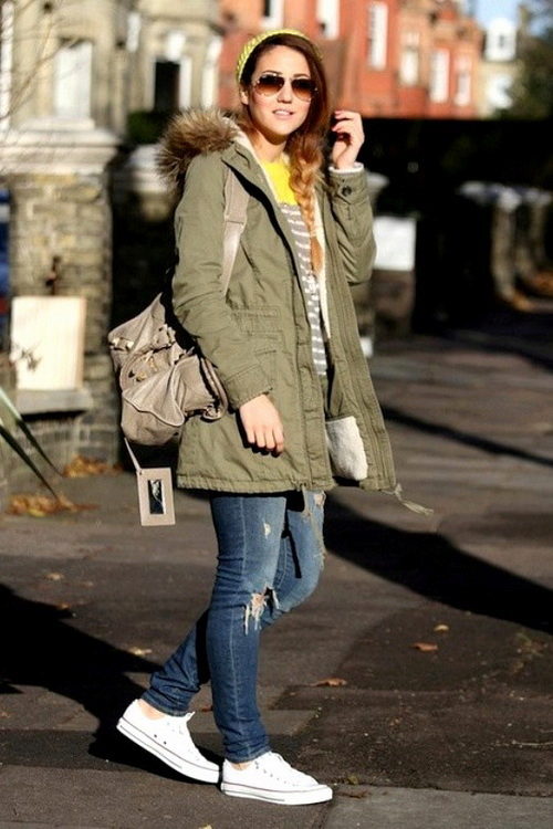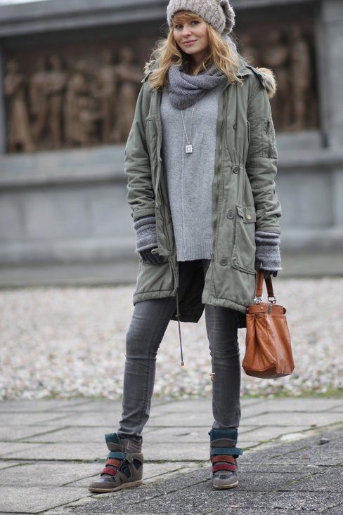 The park is a truly universal thing. It can be combined with a huge amount of clothing. Whether jeans, dress or skirt. From shoes you can pick up sneakers, boots or boots on a low platform.
