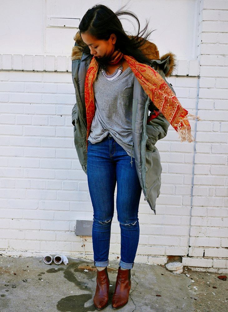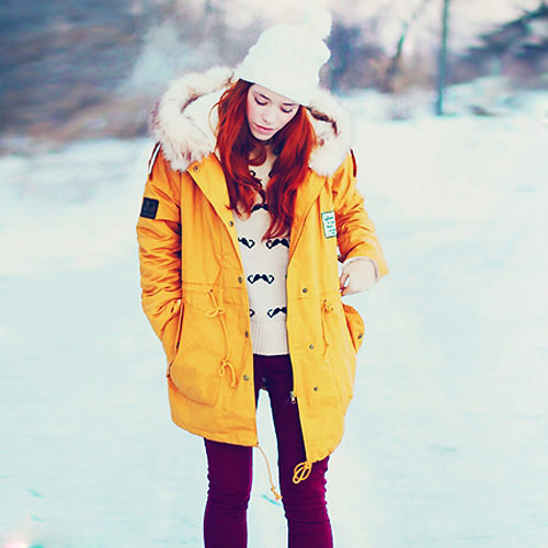 Mustard. Another trend this season. Wearing a mustard-colored park, you will already look bright and stylish without any extra details.