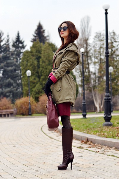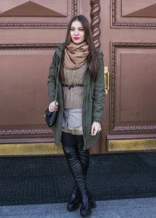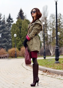 Jacket softer shades goes well with yellow, copper, carmine, dark red, burgundy color. It creates a nice contrast: juicy colors against the background of muted moss or olive look as fascinating as the calm sea and the fiery sunset. With marsh color you can combine things in brown, beige, black and white.
