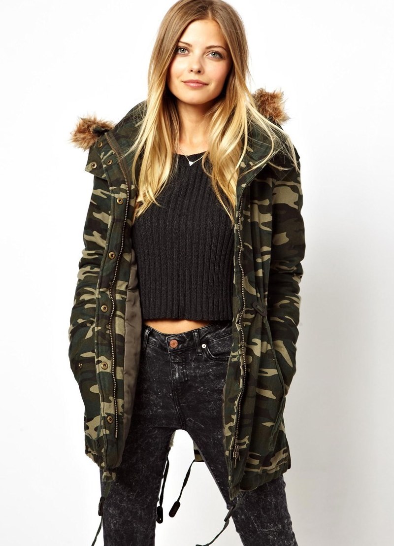 It should be noted military style, which perfectly fit the park in khaki. Dark green camouflage pants will be appropriate here. From shoes suitable boots, boots, high-laced boots, berets, Martins, and timbers. You can pay attention to the green parks with camouflage, which look very original and bright. In this color options may be present with the addition of brown and white.