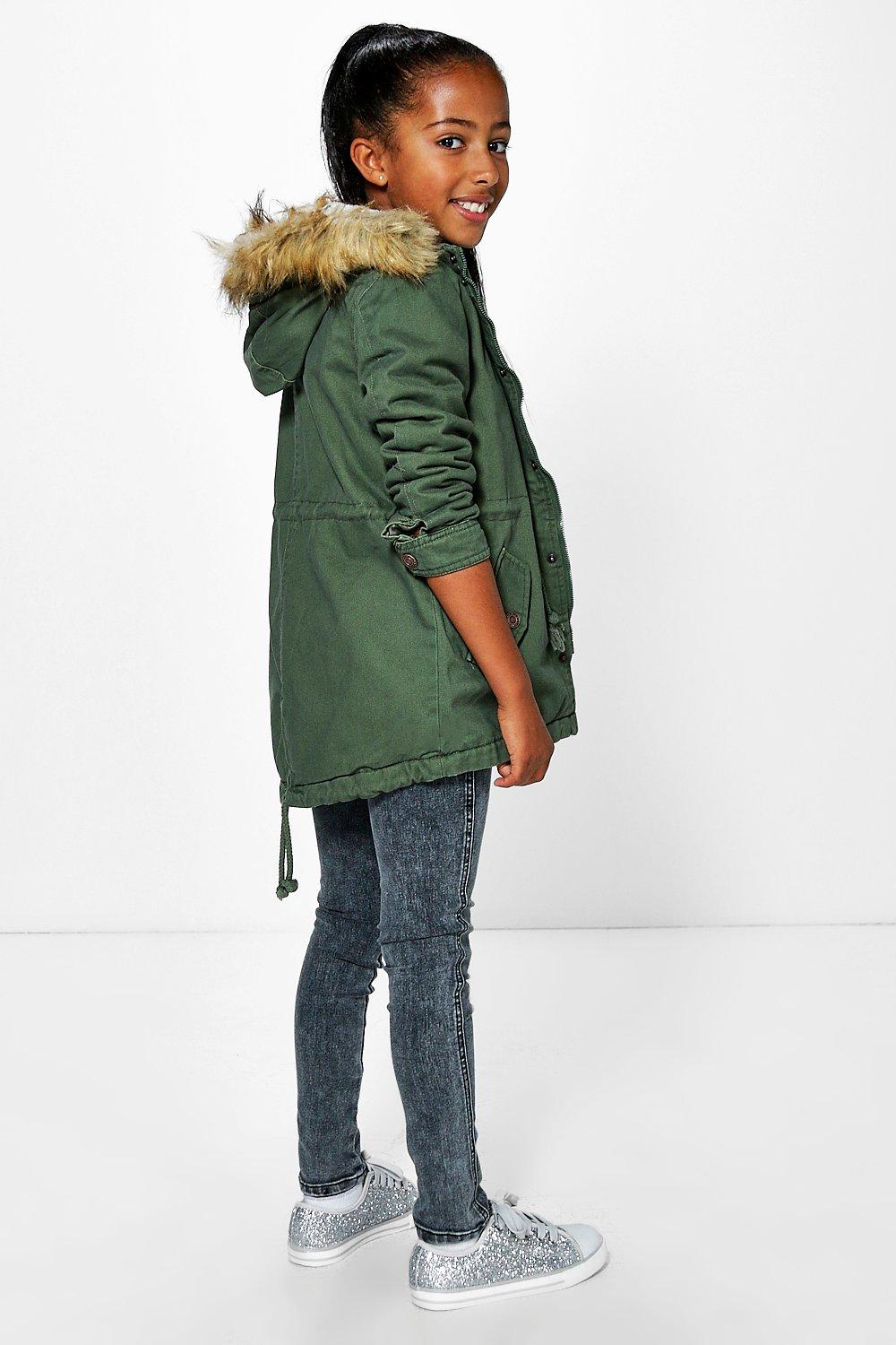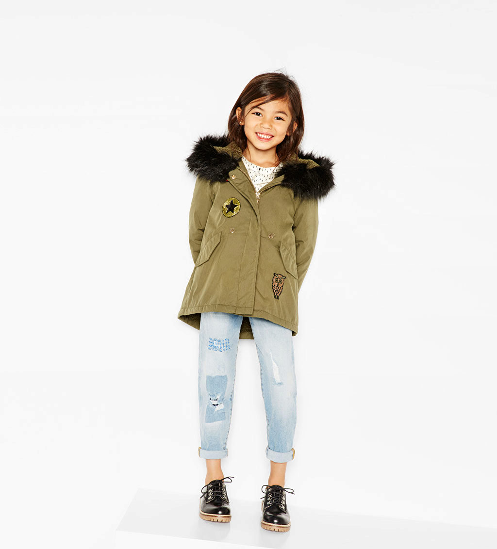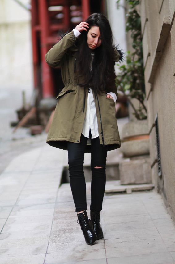 - White elongated shirt, black skinny, black pointed toe boots and a khaki park. If you replace jeans with holes in this look with a classic model or with trousers, you will get a perfect look for school. Do not forget about the bulk bag and accessories.