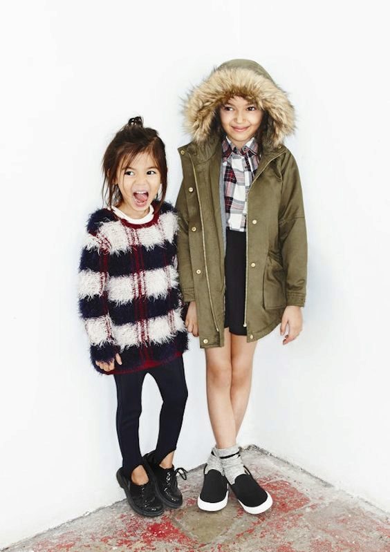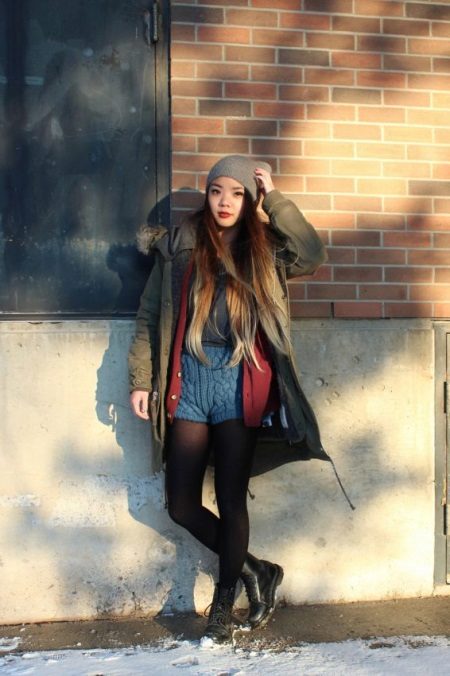 - An interesting image for brave and confident girls. A gray jumper, a red cardigan, black tights and short blue knit shorts. If your daughter chooses these, you definitely do not have to worry that she will freeze. The image is complemented by an elongated park, gray beanie cap and black lace-up boots.
