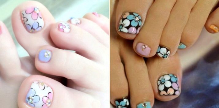 Of course, this is not all design options flower pedicure. Many techniques can be combined to create something new and unusual. Do not be afraid to use such decorative elements as beautiful rhinestones, stones, bouillons and foil. All these details can very beautifully complement modern pedicure.
