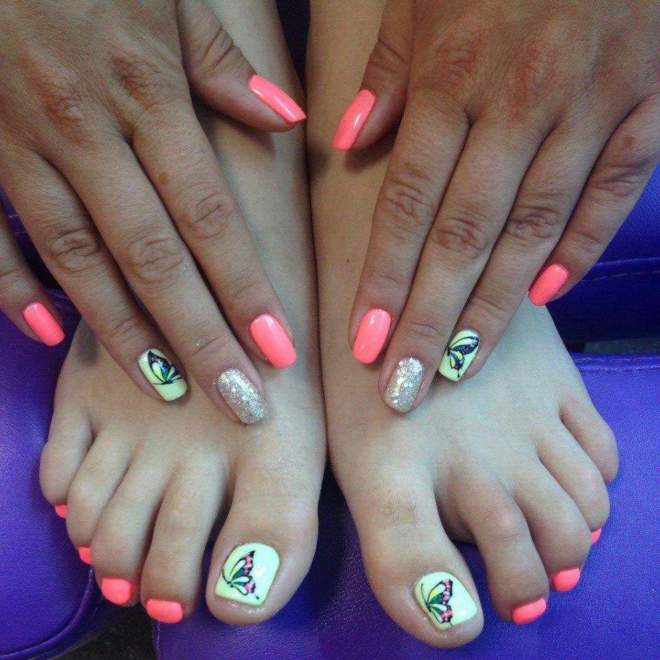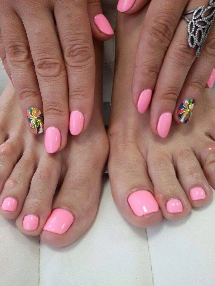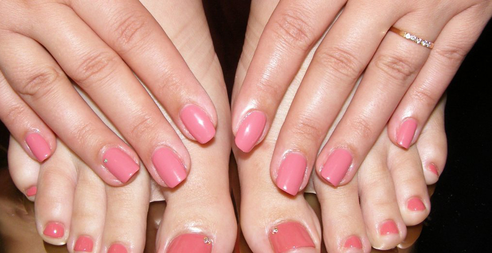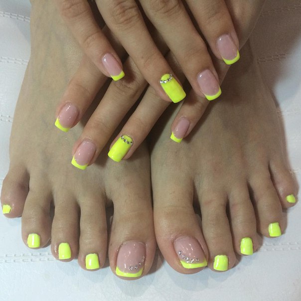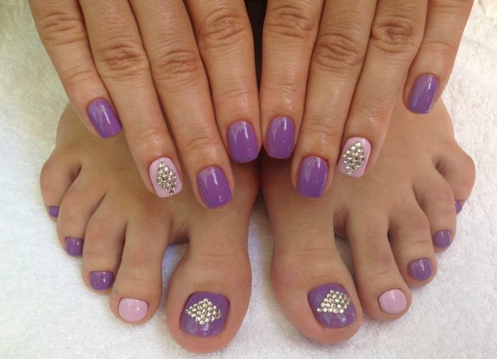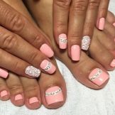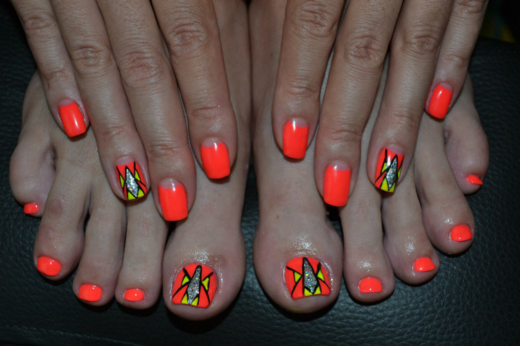 - To form a harmonious uniform style of manicure and pedicure, stylists provide strict rules for the combination of tones and textures. It is necessary to use classical colors (all shades of red, beige, pink, violet, coral), it is not recommended to apply a solid sheen and causing neon.