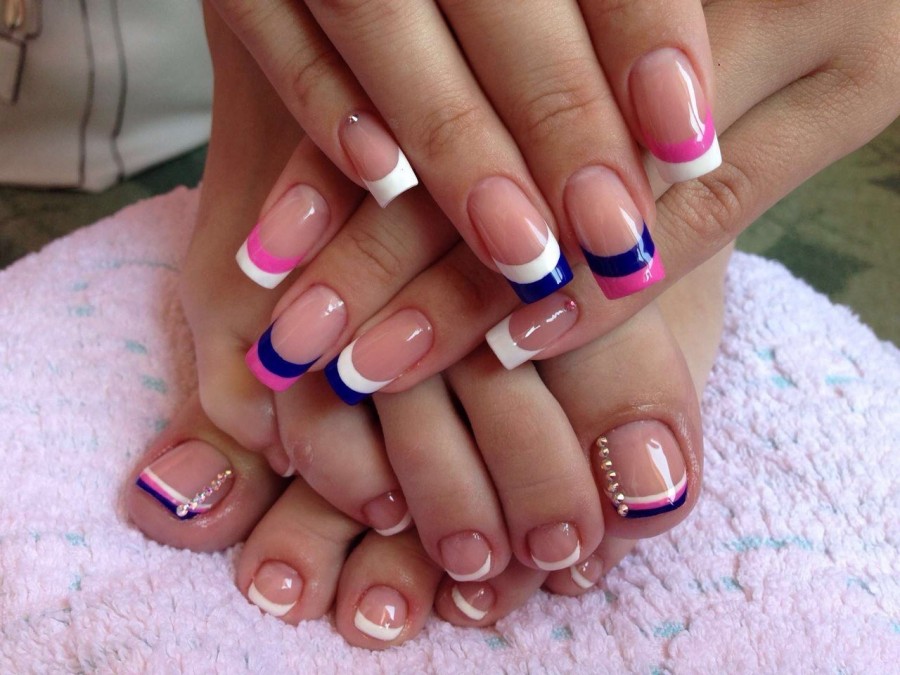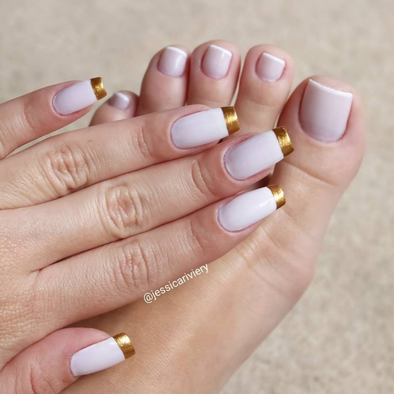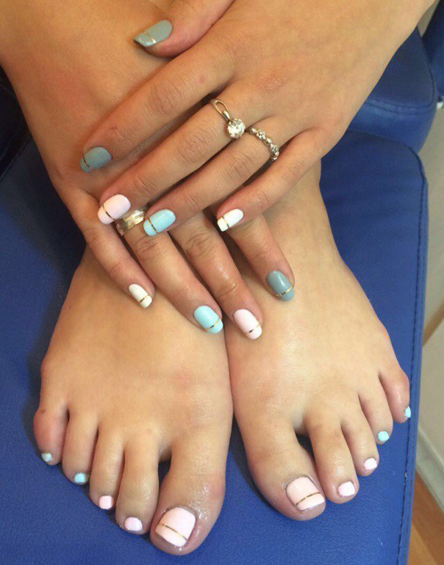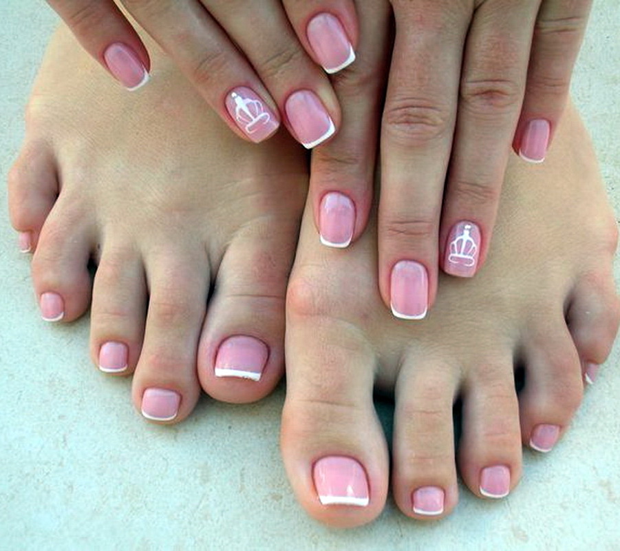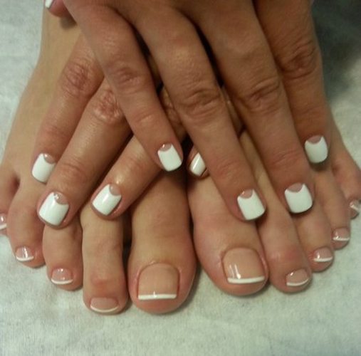 French manicure and pedicure are very popular since the end of the twentieth century.In the current year and in the coming years, stylists propose that such traditional white stripes should be depicted in a completely different style and apply bright colors that are in trend today. These include shades such as blue, gold and even black. The drawing of the base and the strip can be modified and sometimes made asymmetric.