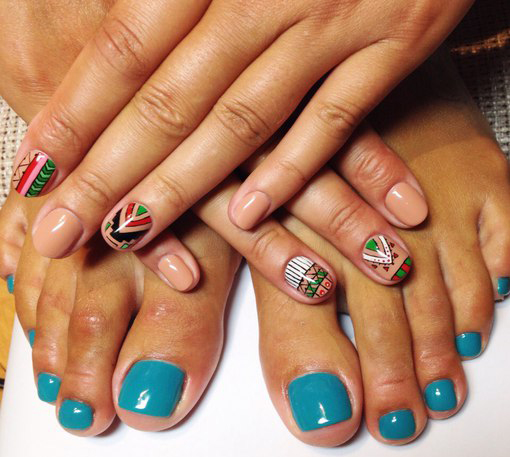 Successfully made manicure and pedicure in the same style, above all, welcomes and reflects the winter mood, which can be reflected on the nails as translucent delicate snowflakes, cute snowmen, various symbols of the New Year holidays, such as Christmas trees, deer, bright Christmas decorations. To the winter version of manicure and pedicure is covering the nails in the style of "cat's eye". If we talk about the palette of Christmas colors, it is very diverse: gray, beige, silver, pink. Matt patterns that are made in dark colors are very relevant this season.Always in vogue red color, which is used in the French and the moon cover nails.