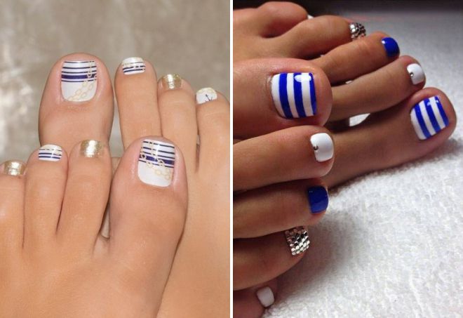 The cool colors of this season are represented by muted tones of blue. In this case, a pedicure can be either monophonic or combined, combining up to several contrasts.The effect of ombre is achieved by combining blue with lilac, often blue combined with white, silver, blue and black. Turquoise tones of a color palette are combined with white, creamy, lilac shades.