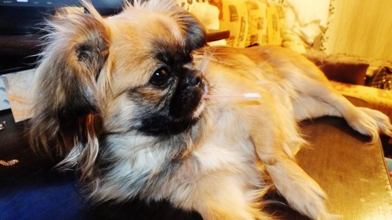 And also remove sulfur from the ears of the Pekingese with a cotton swab.