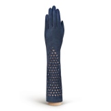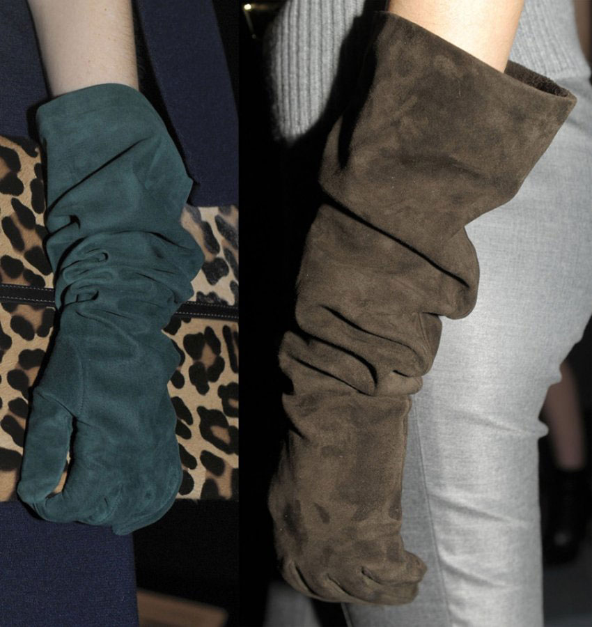 - Long gloves from suede will decorate any image. Suede - quite versatile material that looks good with skin and with furs. Suede gloves can be demi-season (with synthetic lining) and winter ones with fur.