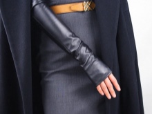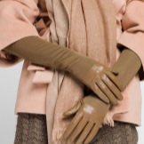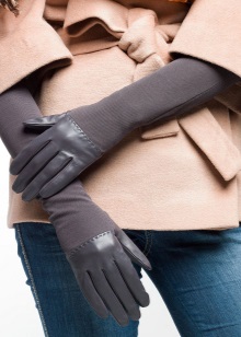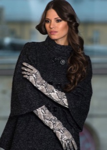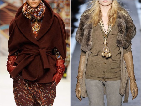 Leather gloves or lyrky long above the elbow look good with a poncho, with a raincoat and autumn coat with sleeves ¾. With tunics, vests and down jackets, fabric or cashmere long gloves look good. For an evening dress fit satin or openwork gloves the length of the elbow and above.