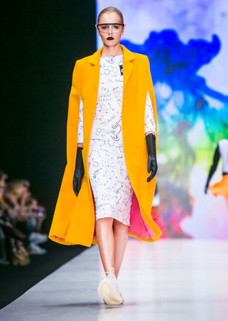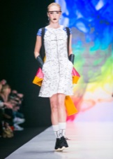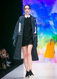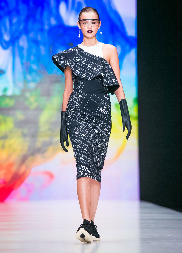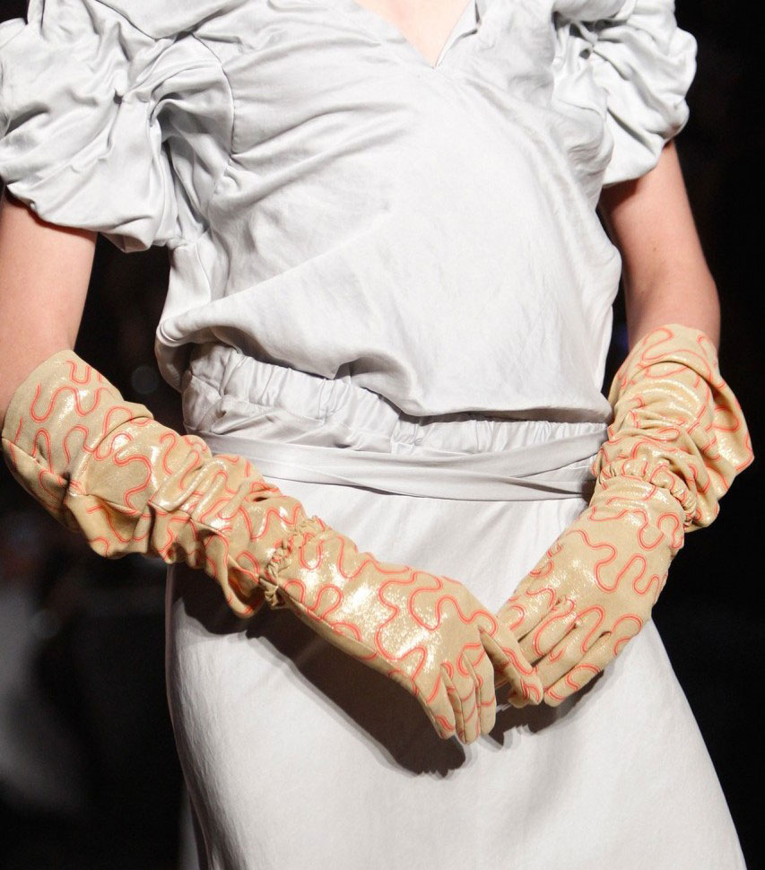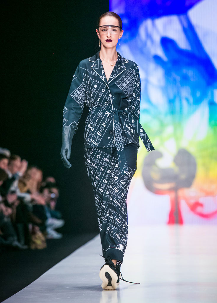 At the last show of designer Dasha Gauzer, the periodic collection’s accent was on the collection. Formulas, chemical elements have become bright prints on clothes. And these images were complemented by black long rubber gloves.