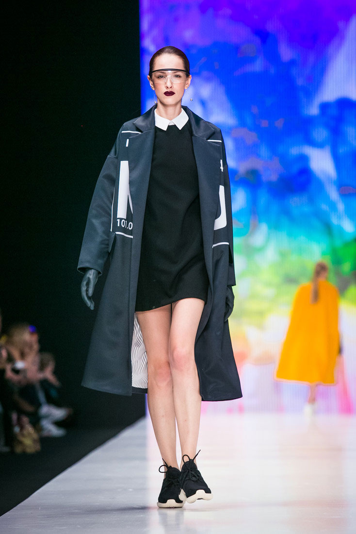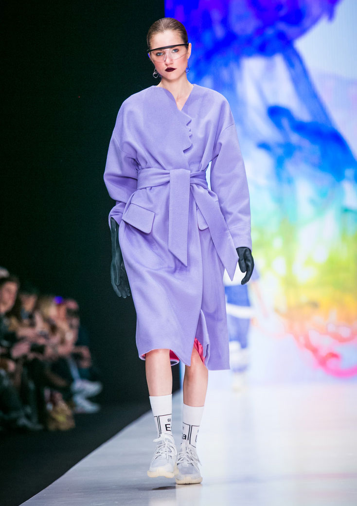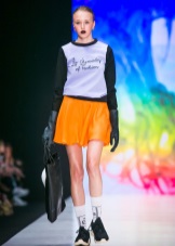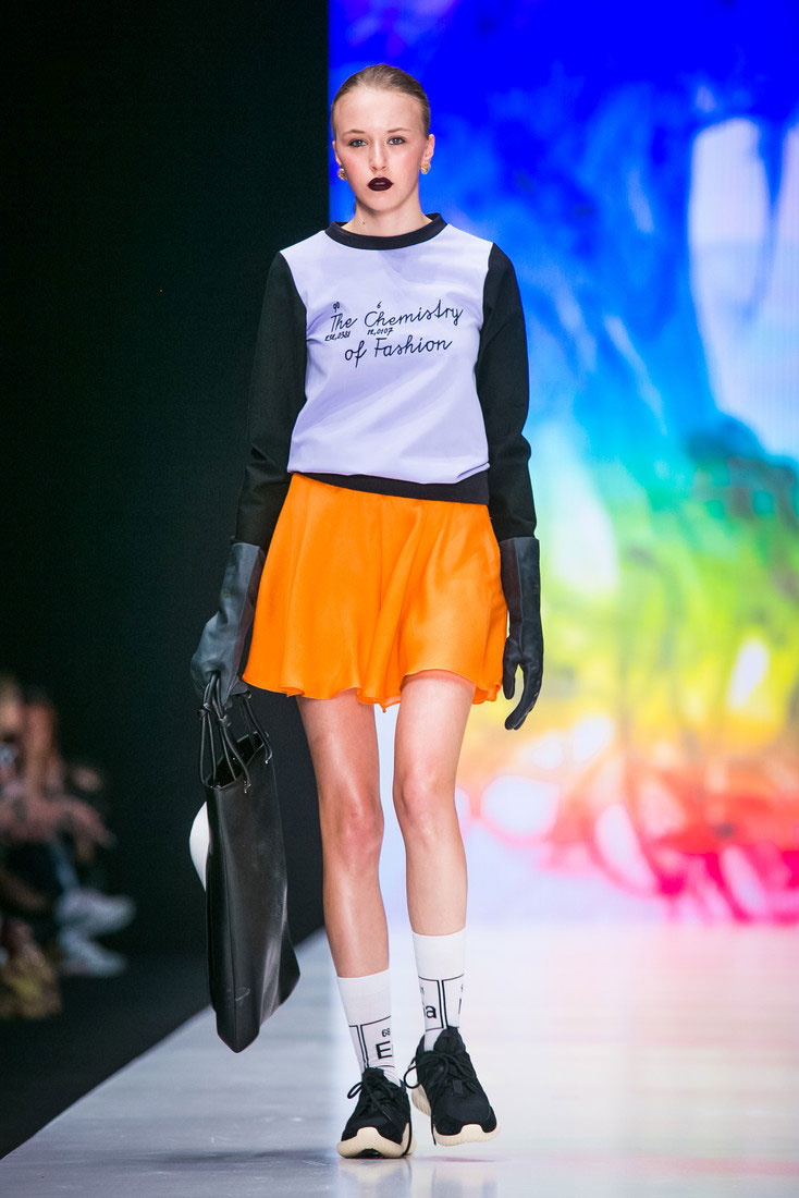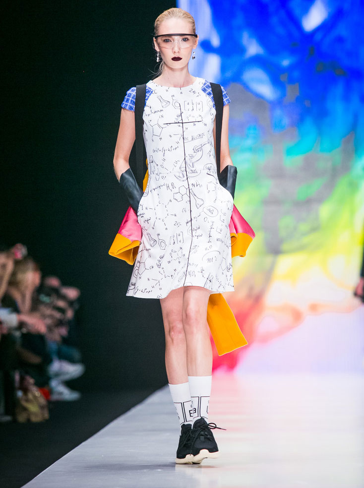 At the last show of designer Dasha Gauzer, the periodic collection’s accent was on the collection. Formulas, chemical elements have become bright prints on clothes. And these images were complemented by black long rubber gloves.