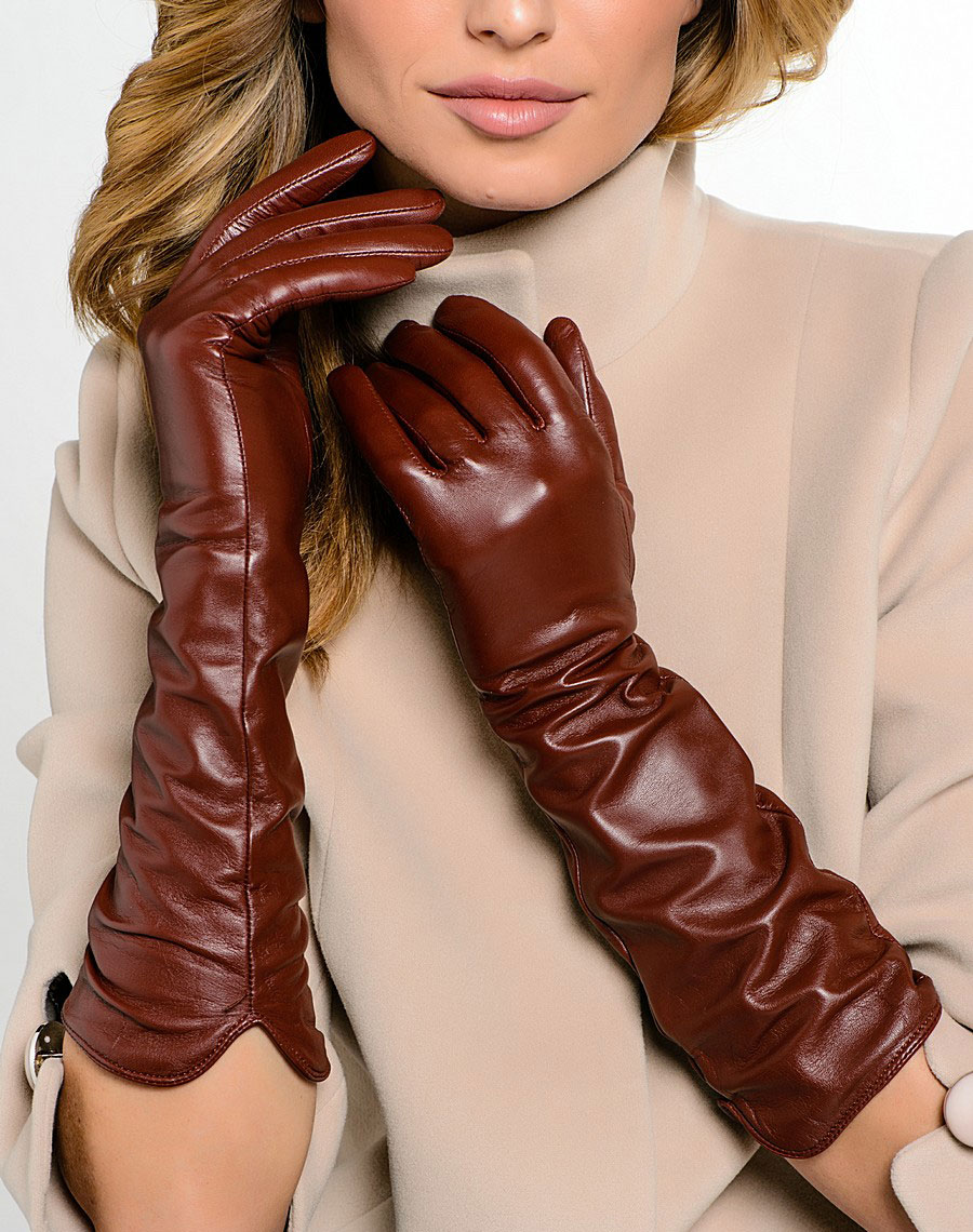 Black is a classic color for all times. It is combined with a large variety of outfits. Black long gloves make a woman's hand refined, elegant. Also suitable for gloves brown colors, pastel and beige gold tones. Brown gloves are the best choice for those who have more natural colors in their wardrobe - beige, dark red, gray.