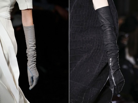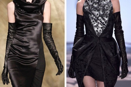 This accessory, as long gloves, is now very popular. Designers offer quite a large selection of models. There are classic long gloves up to the elbow or above. There are models where the solid hole is designed for 4 fingers and separate for the thumb - these are mitts. If the product is made of leather and there is an outlet for each finger, but without the top - this is gloveletta.