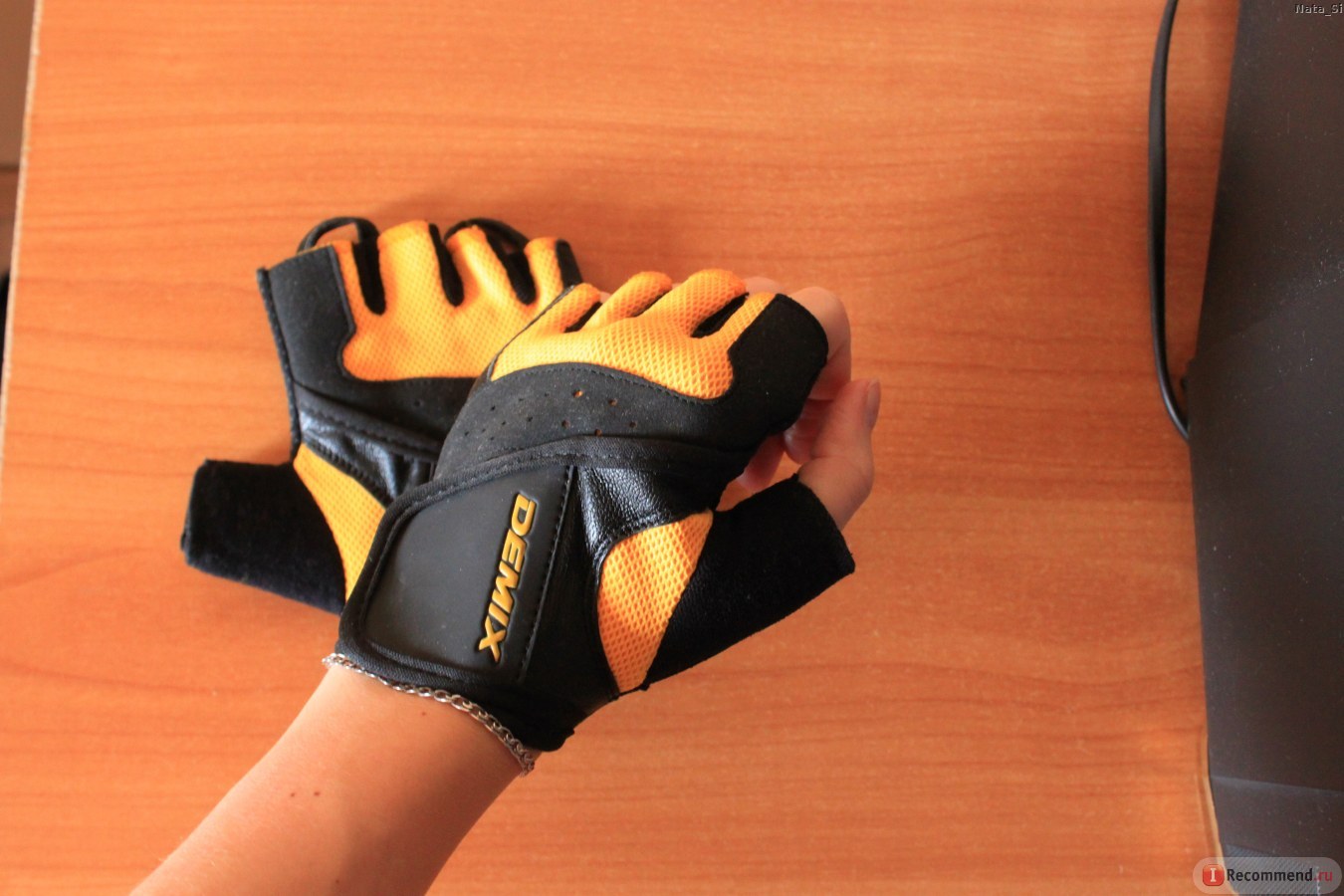 - Gloves for fitness company Demix - the ideal cheap option for a beginner in fitness: the cost of about 600 rubles, even if you leave classes in a month in the gym, you will not be sorry for the money spent. These gloves are almost the same as Torneo gloves: they are also equipped with special eyelets, thanks to which you can easily remove this sports accessory. On the back side, like most gloves, there is a special mesh that absorbs moisture. Gloves colors and sizes are the most diverse, everyone can find what he needs.