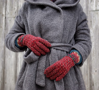 Blue color looks great with red outerwear. Versatile are black gloves. They will be a great addition to almost any outfit. Lipstick of bright color or lip gloss will also perfectly harmonize with them.