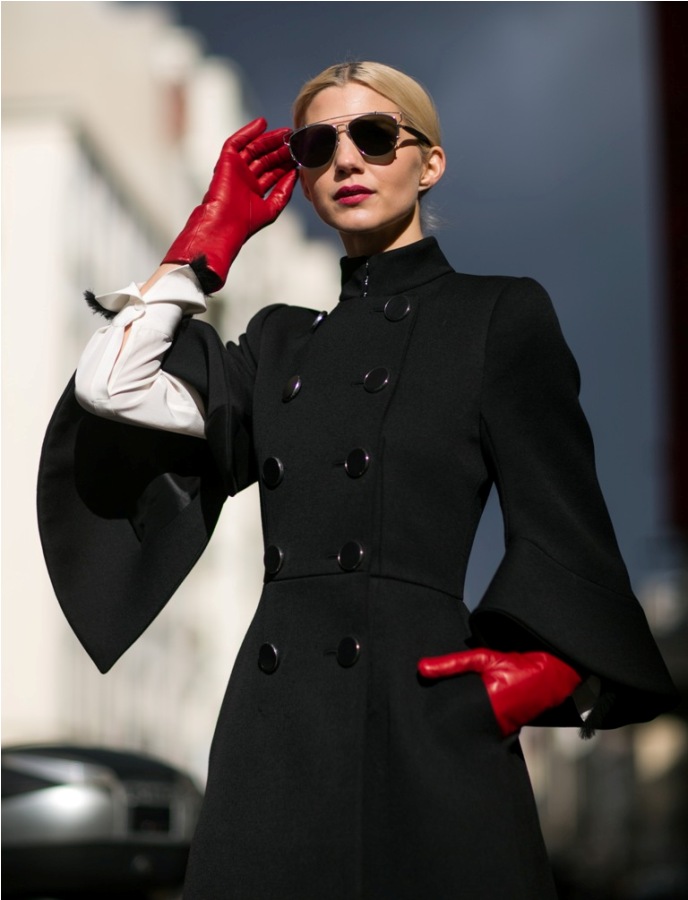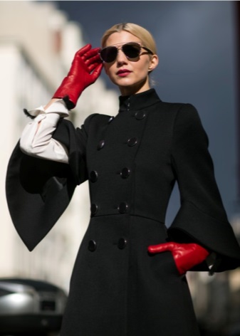- The game of contrasts is a red coat and black gloves of standard length, decorated with fur. It creates a comfortable and cozy bow for walking, shopping, visiting museums or the theater.