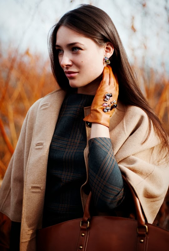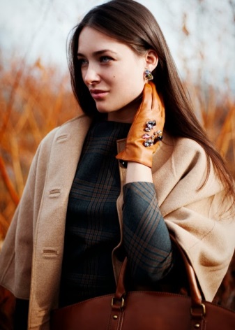 - Extravagant look - cashmere checkered cape and red elongated gloves. In a bow two trends are combined - a cage and red gloves. This is his charm and charm. This outfit will appeal to auto-lady.