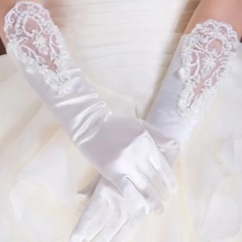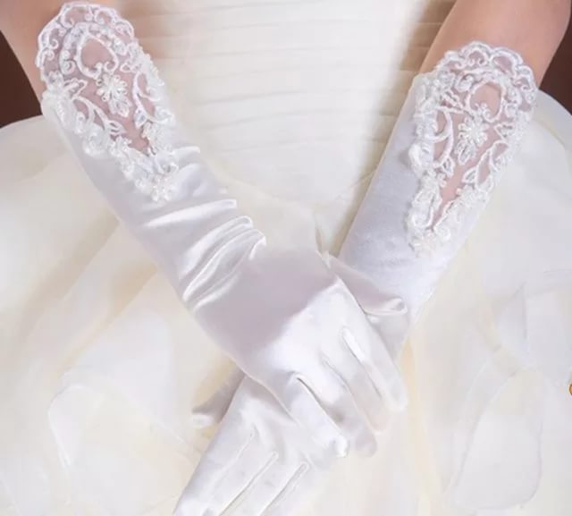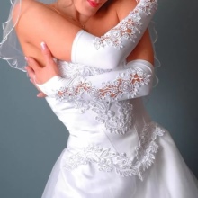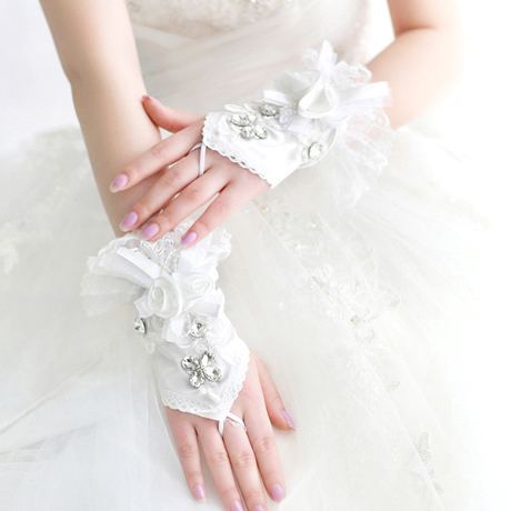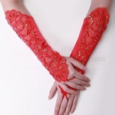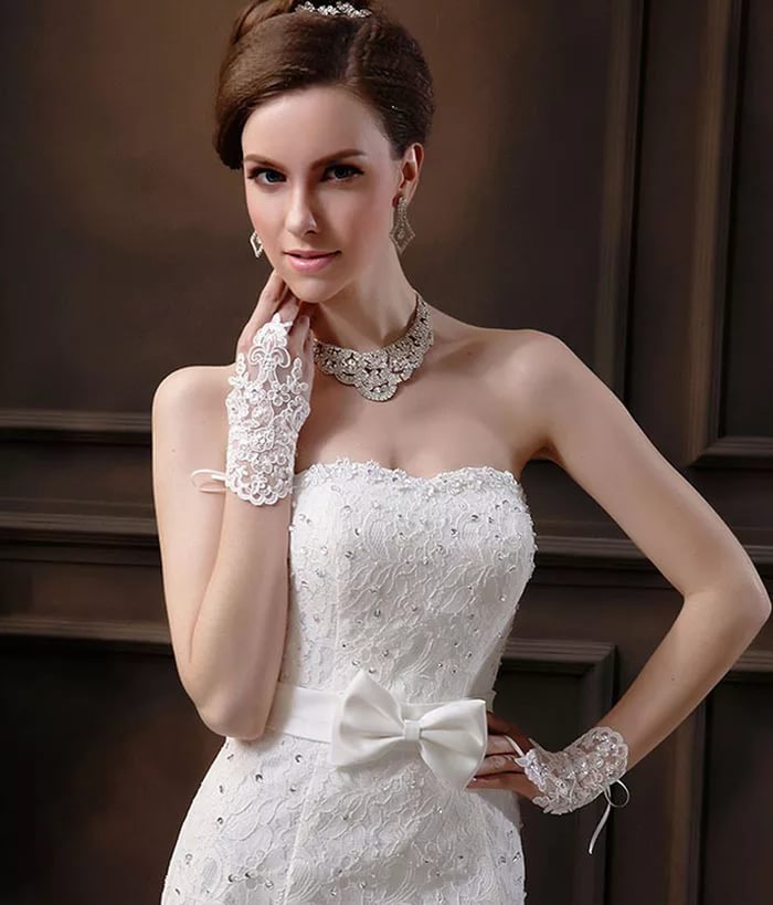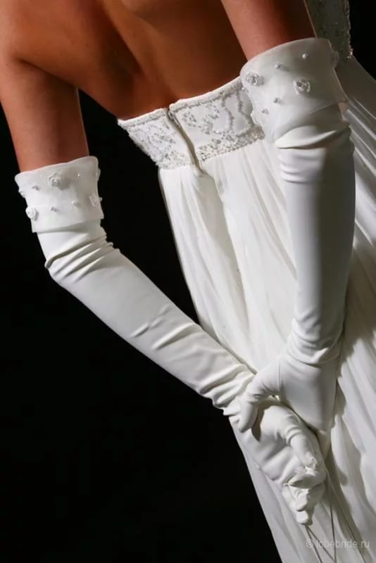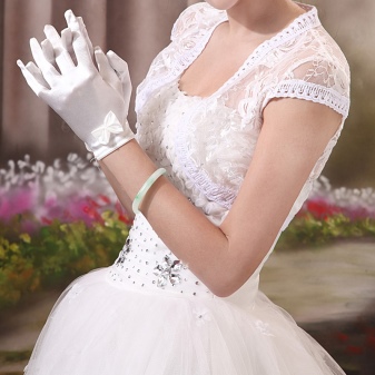 Quite a few models of gloves can be attributed to this category, most of which are used as a decorative element of the bow. For example, silk, satin and velor gloves very harmoniously complement the image of the bride on her most important day. Wedding models usually do not have fingers, so putting on a wedding ring at the most solemn moment will not be difficult for the groom. Often they are performed with lace mesh inserts, which makes them even more delicate.