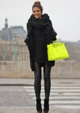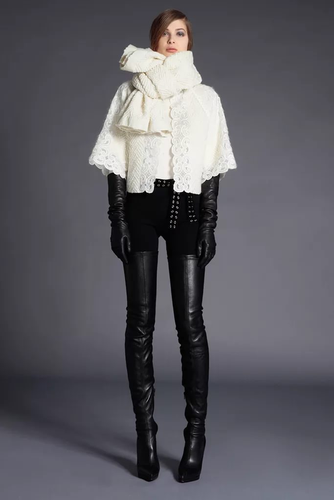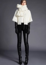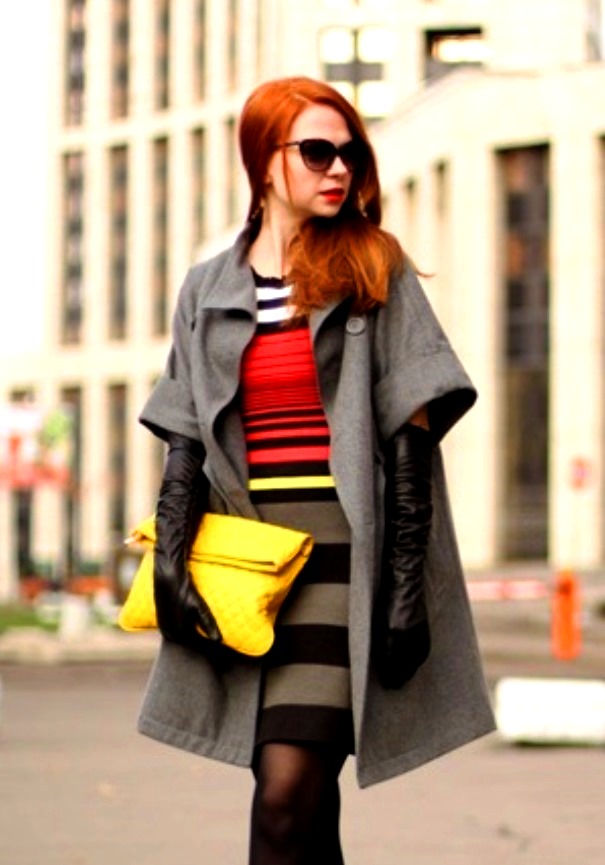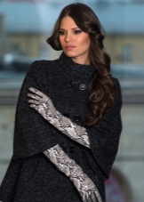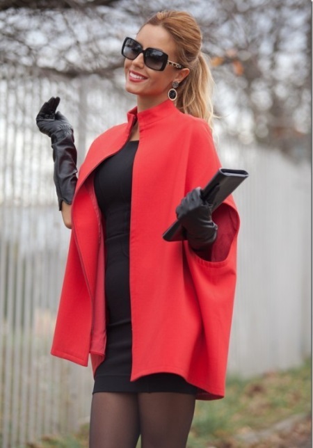 A very feminine and stylish look is a red poncho with a short sleeve in combination with leather black elongated gloves. The classic red and black color combination makes this ensemble almost eternal. A short dress emphasizes the slimness of the female legs and adds even more femininity to the bow. Perfect ensemble to visit the office, where there is no strict dress code.