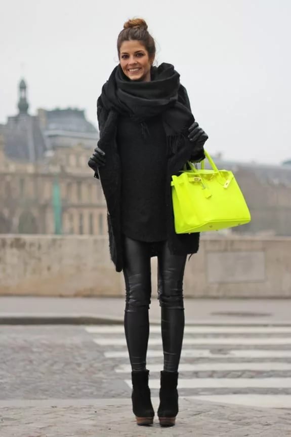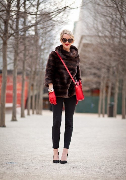 Red color again. No wonder he is so often present at fashion shows, and for good reason celebrities increasingly include him in their images. It symbolizes passion and embodies in the female ensemble audacity and desire to stand out and attract attention. As in this image - a combination of red gloves and the same bag over the shoulder immediately draws all eyes to itself, being a bright accent in the image. The avtoledi fur coat is a basic item in the set as well as black skinny pants. In general, this combination will be appropriate when going to the movies, shopping or just while walking through the winter city.