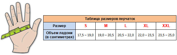 If you do not have the opportunity to try on gloves before purchasing (for example, in the case of an online purchase), you can determine your own size. To do this, measure the width of your palm, clasping a hand tape at the level of the base of four fingers with a measuring tape. The thumb is not involved in this dimension. By comparing this value with the data in the table below, you can easily buy the right size gloves.