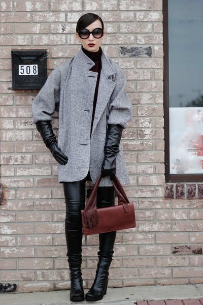 In this image, everything is very harmonious - a sweater of large knit, straight short skirt of beige-brown color, and accessories, which are the accent of the whole image. The burgundy color, being the main one, looks very elegant on gloves, scarves and ankle boots. A voluminous clutch successfully completes this stylish ensemble.