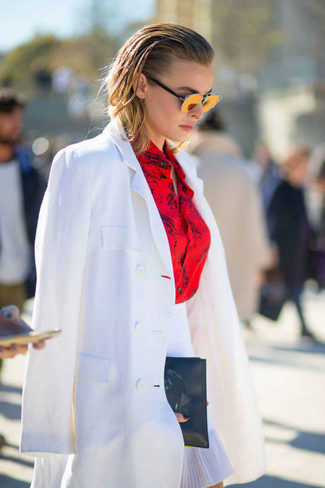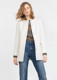 A long white jacket today is stylish. The length of such jackets can be from mid-thigh to the knee. Due to this length, your figure will look more feminine.