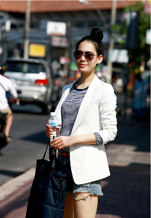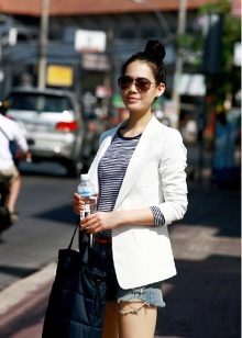 Shorts in combination with a white jacket will give originality to the image. Choose dark shorts or with a print and a dark top, diluting the image with ankle boots on the heel.