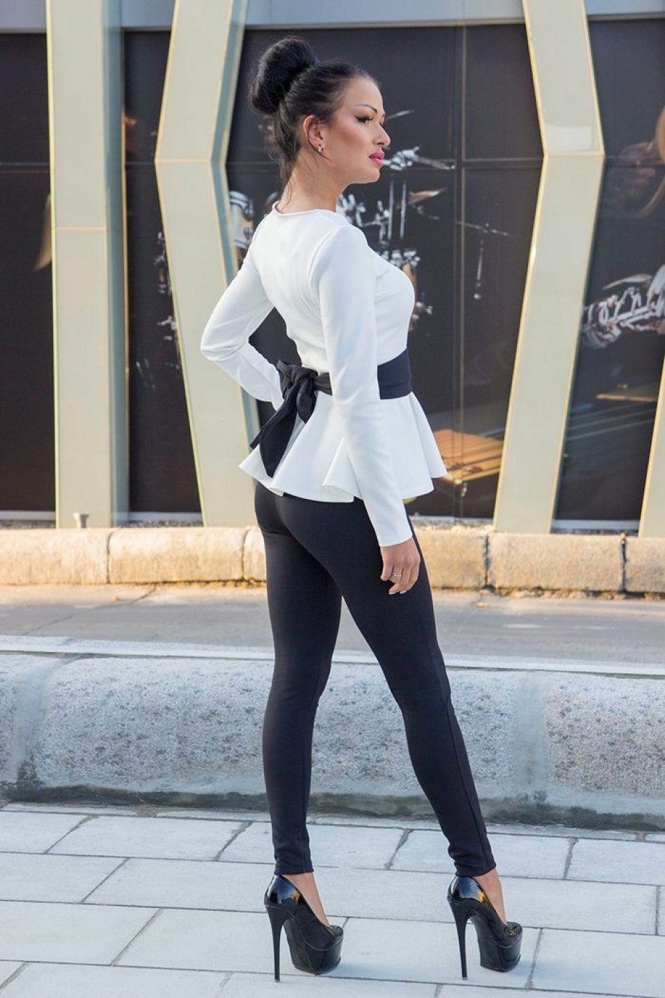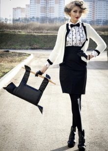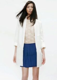 - To create a bright image, choose a top of dark colors. He will play in contrast with a white jacket. To harmonize the image will help light top, such as gray or beige.