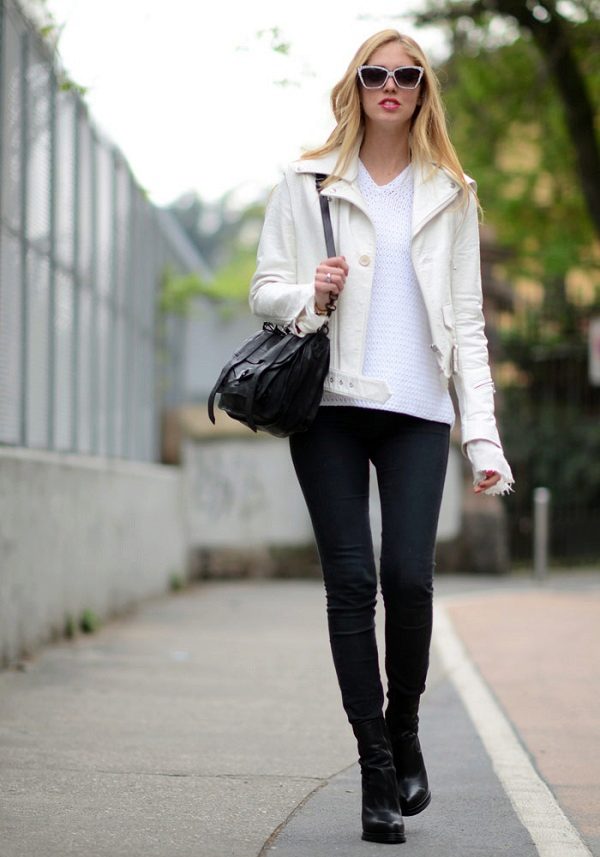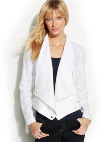 A white jacket-leather jacket fits the youth style more. Such jackets are combined not only with jeans of various shades, but also with skater-skaters. Also interesting is the combination of this model with a long summer dress.