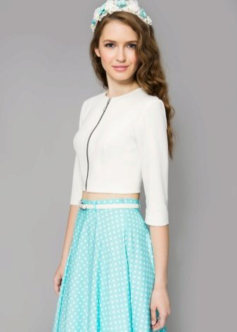 You can create an evening bow by wearing a fluffy dress and a cropped white jacket, for example, a dress with a taffeta cut-off skirt.