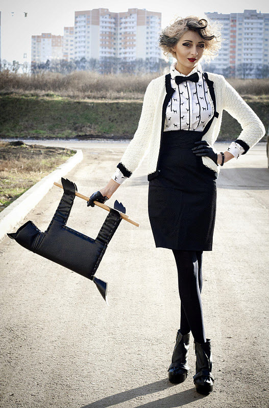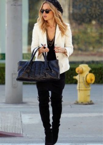- A win-win combination of black and white will add brightness to your look. So feel free to wear a black shirt or blouse under the jacket. Dilute this combination with large bags of black or beige. Also choose watches or bracelets as accessories.