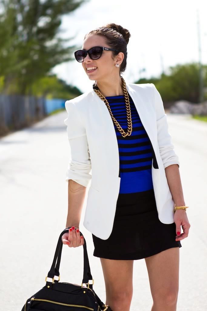 On a hot autumn day, wear a striped blue shirt under your jacket. Add a short cotton skirt. Accessories, for example, a big black bag and a powerful chain “under gold” with a bracelet, will help to finish the image.
