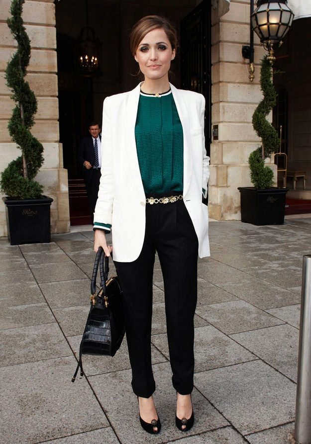 To create an office style, wear a thin emerald blouse with a white trim on the collar. Black cropped trousers and velvet sandals will be a good addition to your style. To complete the office bow, take a black leather bag with a print “under the reptile with a metal trim. A metal woven belt for trousers will help to add femininity to the image.