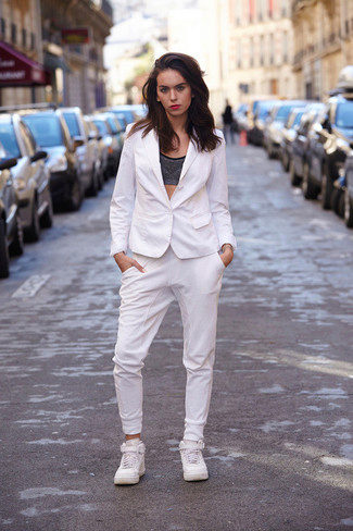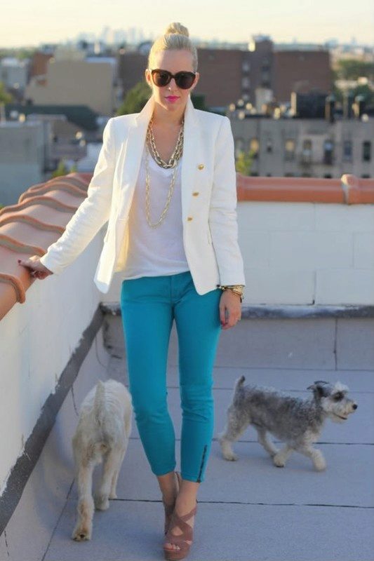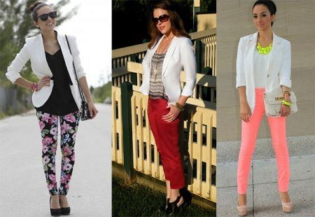 Pants and a white jacket - it is always stylish and diverse. Choose pants of any color, such as pink or burgundy. Love trousers in floral - then combine them with a fitted jacket.