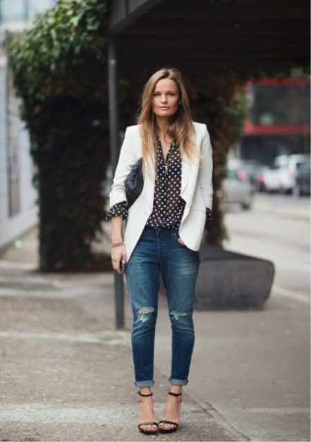 A polka dot blouse is best combined with a classic jacket and jeans.