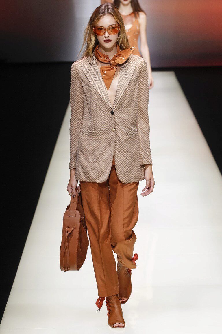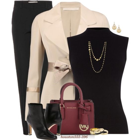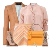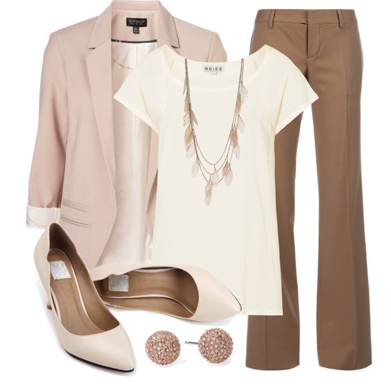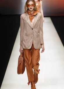 An interesting business look, which consists of a cream-colored blazer, vest and classic amber-colored trousers. A pair of brown leather heeled sandals and a small handbag on a milky chain are complemented by the look.