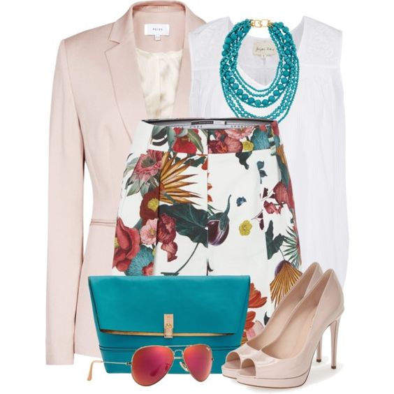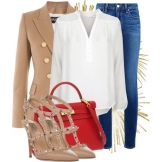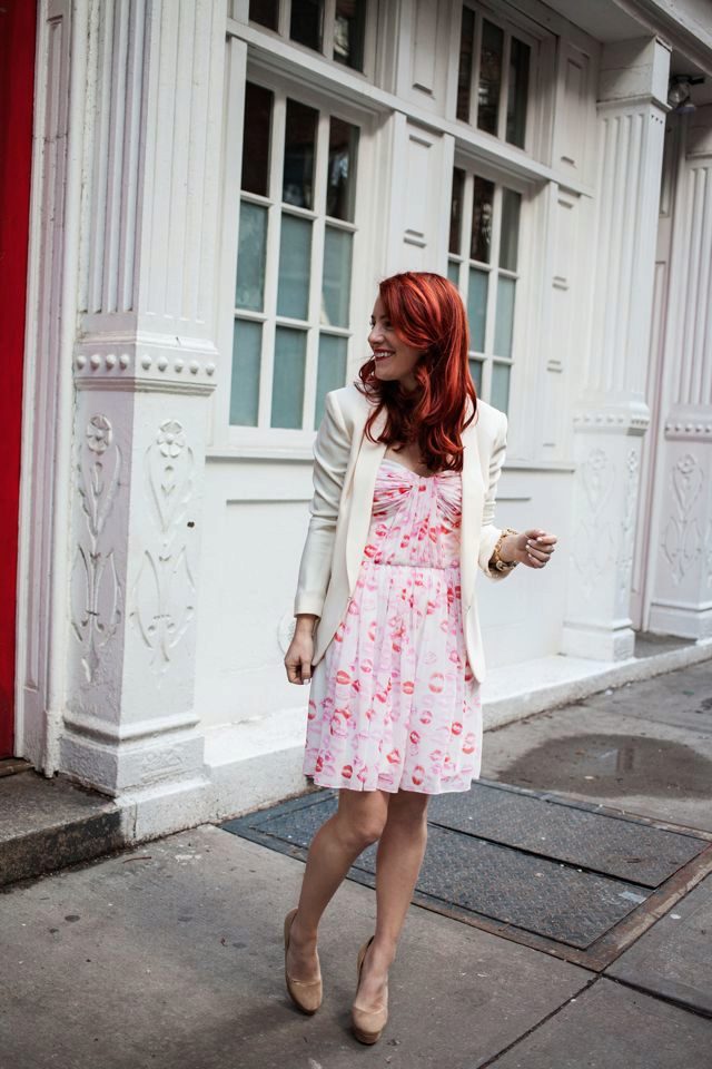 If you want to stand out in the crowd, this image is perfect for every day. But he is also perfect for a romantic date. A creamy blazer and an airy white dress with a red lips print. Complement the image of shoes with beige heels. Believe, the eyes of all passersby will be riveted on you!