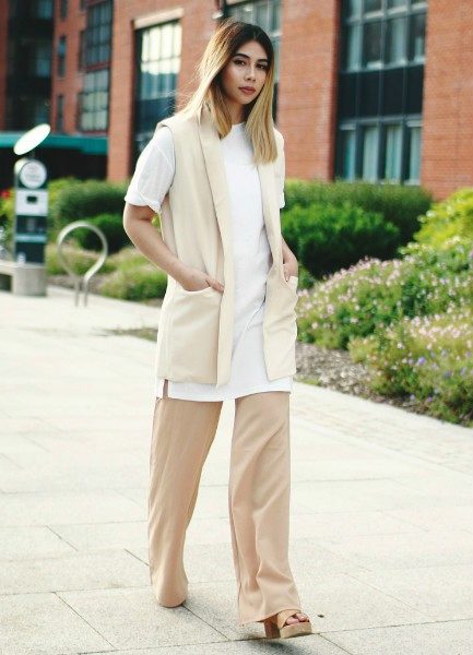 Chic look, consisting of a beige sleeveless jacket, an elongated white top and beige wide trousers. The sandals on the kemel shade platform complete the look, giving it a sophisticated, finished look.