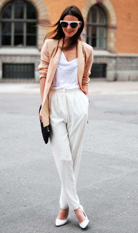 The perfect summer look that fits into a business and casual dress code, it is also suitable for an evening out. Thanks to a loose beige blazer and light white trousers, we get a great look in a casual style. What could be better for a hot summer? The image is completed with white wedge shoes. White-framed sunglasses and a black clutch add a zest to this outfit.