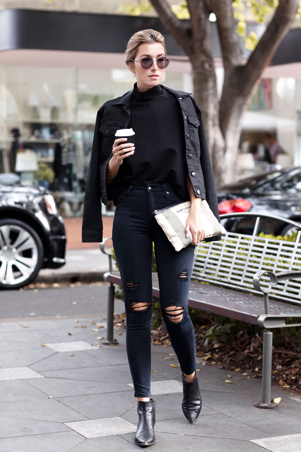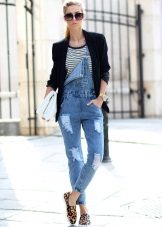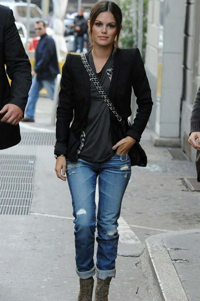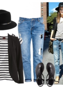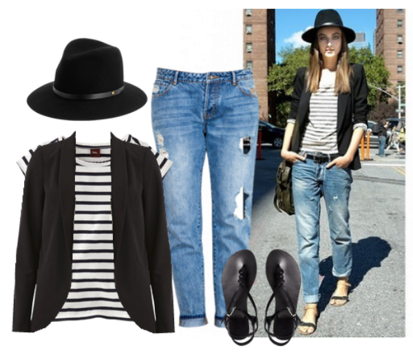 - Naughty urban look: a small black jacket, a black and white striped T-shirt, ripped jeans, black sandals and a black hat.