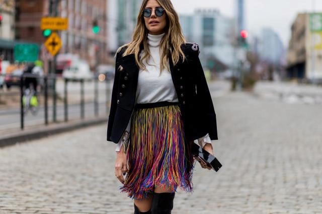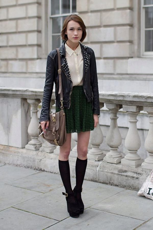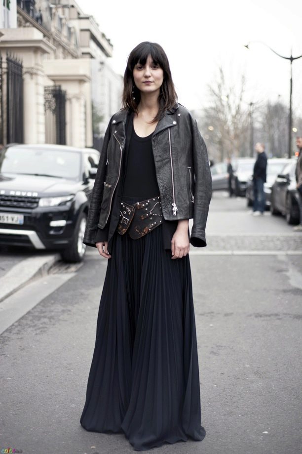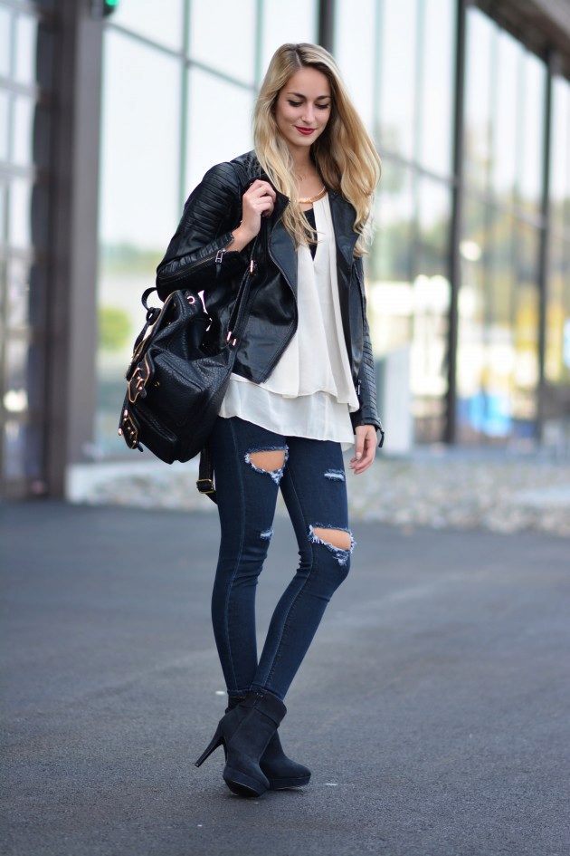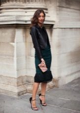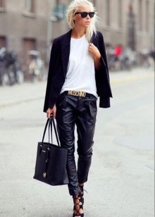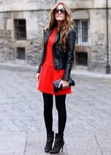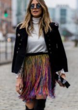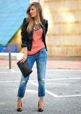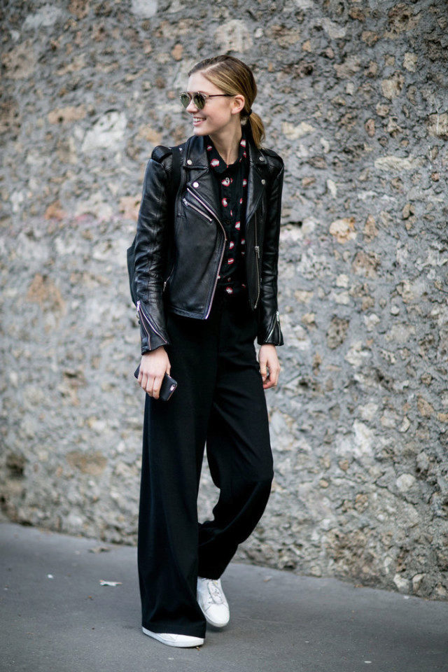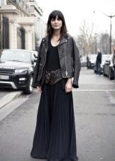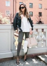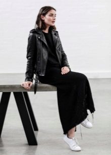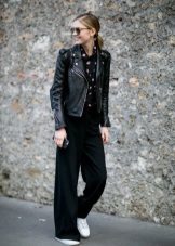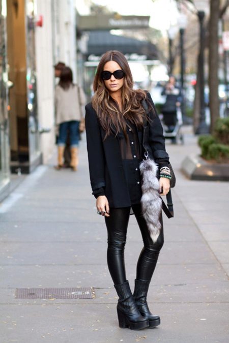 Black jacket and black shirt make up an unusual combination. Not every girl dares wear such a kit. This image looks gloomy, so it must be diluted with colored parts and accessories and always contrasting in color bottom.
