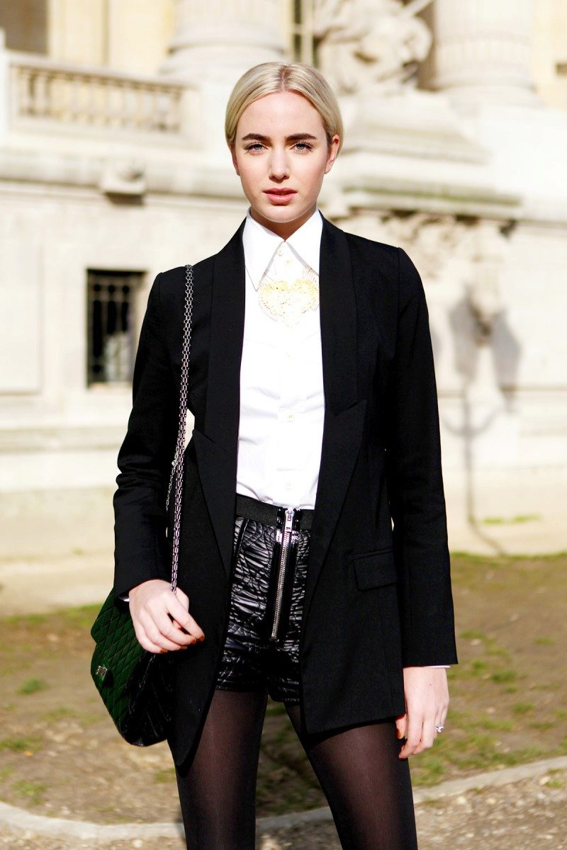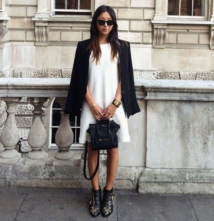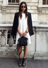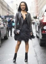 - Monochrome outfit: an example of a successful combination of a black jacket and a black top. The image does not look gloomy, thanks to the snow-white short skirt and white edging on the sides of the jacket.
