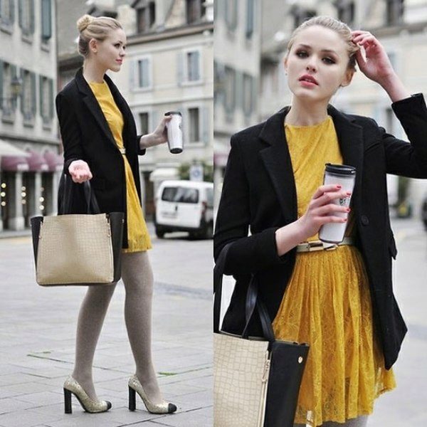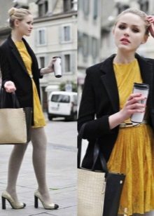 - Bright colors: a long black jacket unexpectedly harmonizes with a romantic dress of rich yellow color. The accessories are more relaxed: a black and beige bag blends perfectly with shoes and a belt at the waist.
