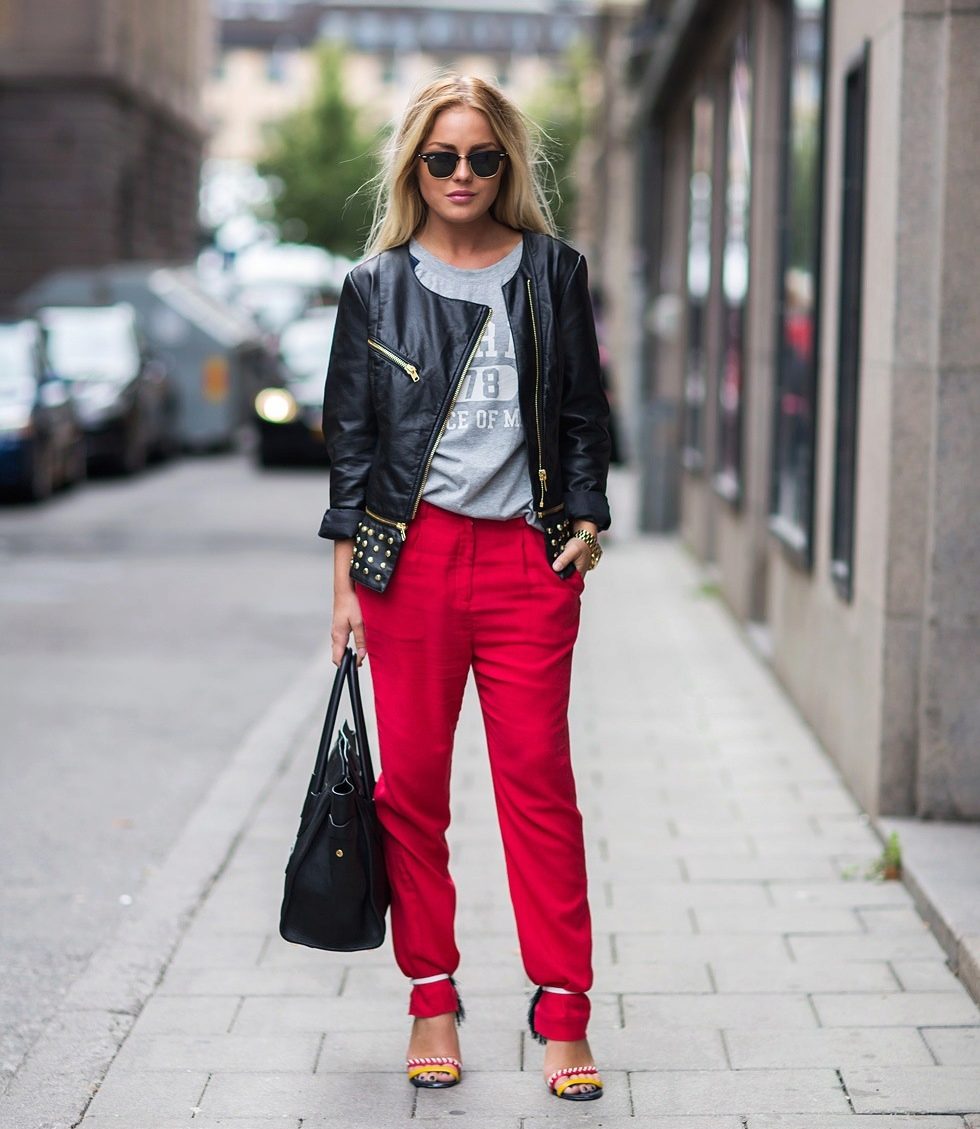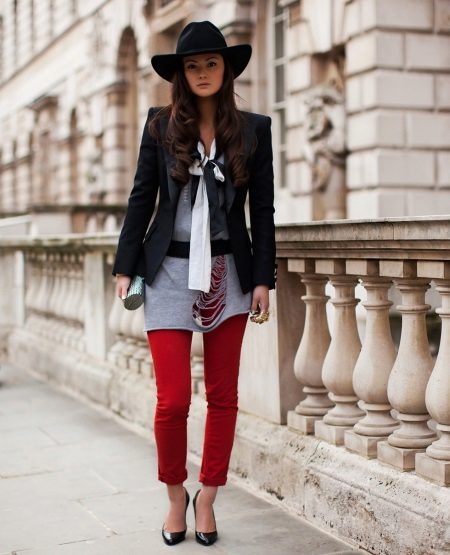 A much brighter and more interesting look will come out if you pick colored trousers with a black jacket. For work, you should choose muted shades, for example, burgundy, dark blue, gray, malachite, etc.