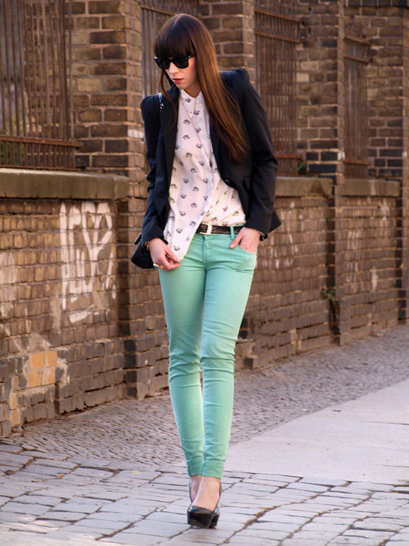 - Light, cheerful bow: the severity of a black jacket is balanced by bright mint-colored trousers and a light-colored shirt. Complement the image of high-heeled shoes, sunglasses and jewelry in vintage style.